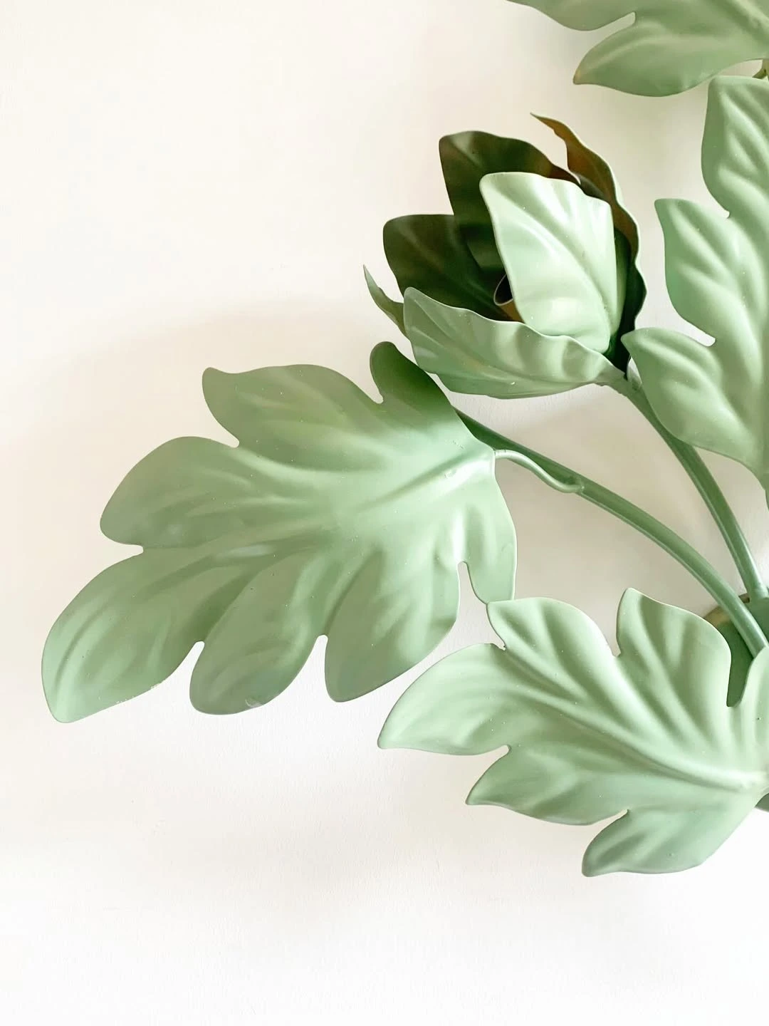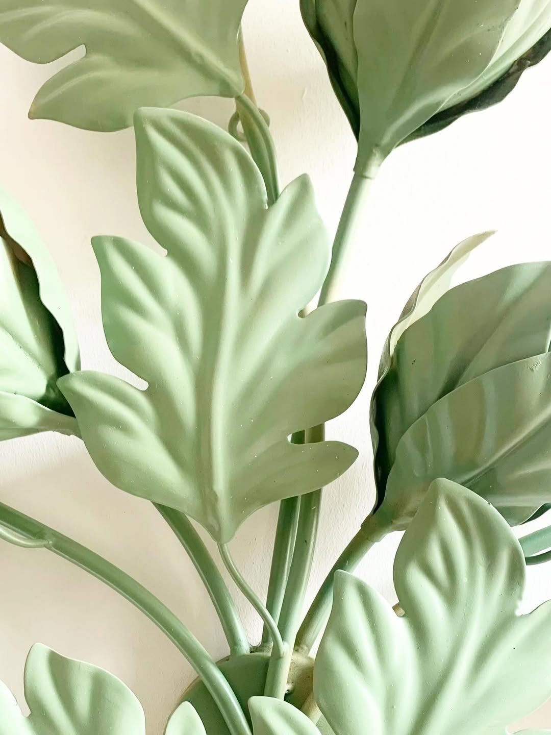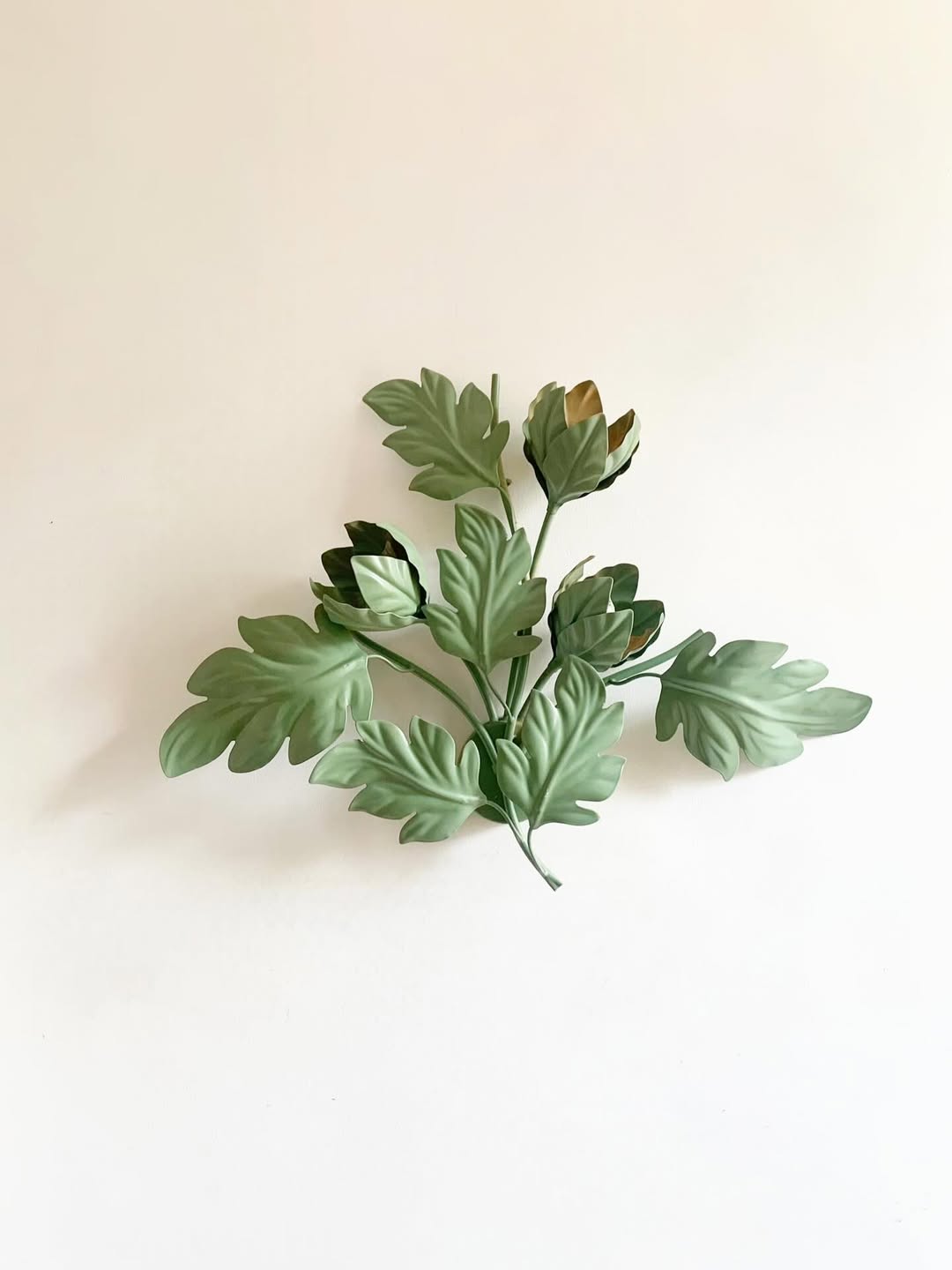 Applique murale en forme de feuillage coloré, en tôle peinte formant un bouquet de feuilles d’acanthe. La composition est étalée avec un joli volume. Travail français ou européen, vers 1950–1960. Typologie : applique murale, luminaire décoratif, feuillage stylisé. trois ampoules sont dissimulées dans les corolles.