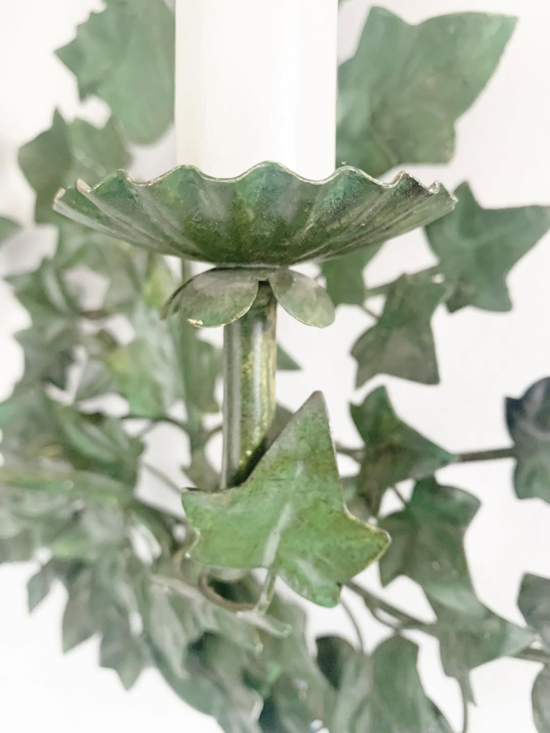 Pair of antique ivy wall sconces in metal, 20th century. Decorative wall lights featuring a Hedera ivy leaf motif, with structured foliage forming the wall-mounted composition. Antique botanical wall lighting with original surface colour, suitable for interior wall installation. Vintage wall sconces, European antique lighting, ivy leaf decorative design.