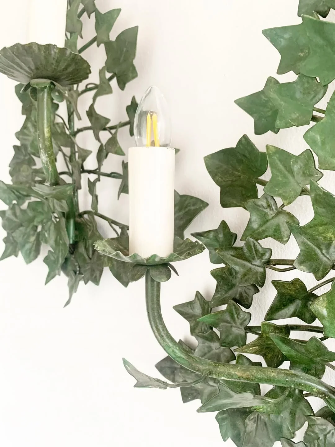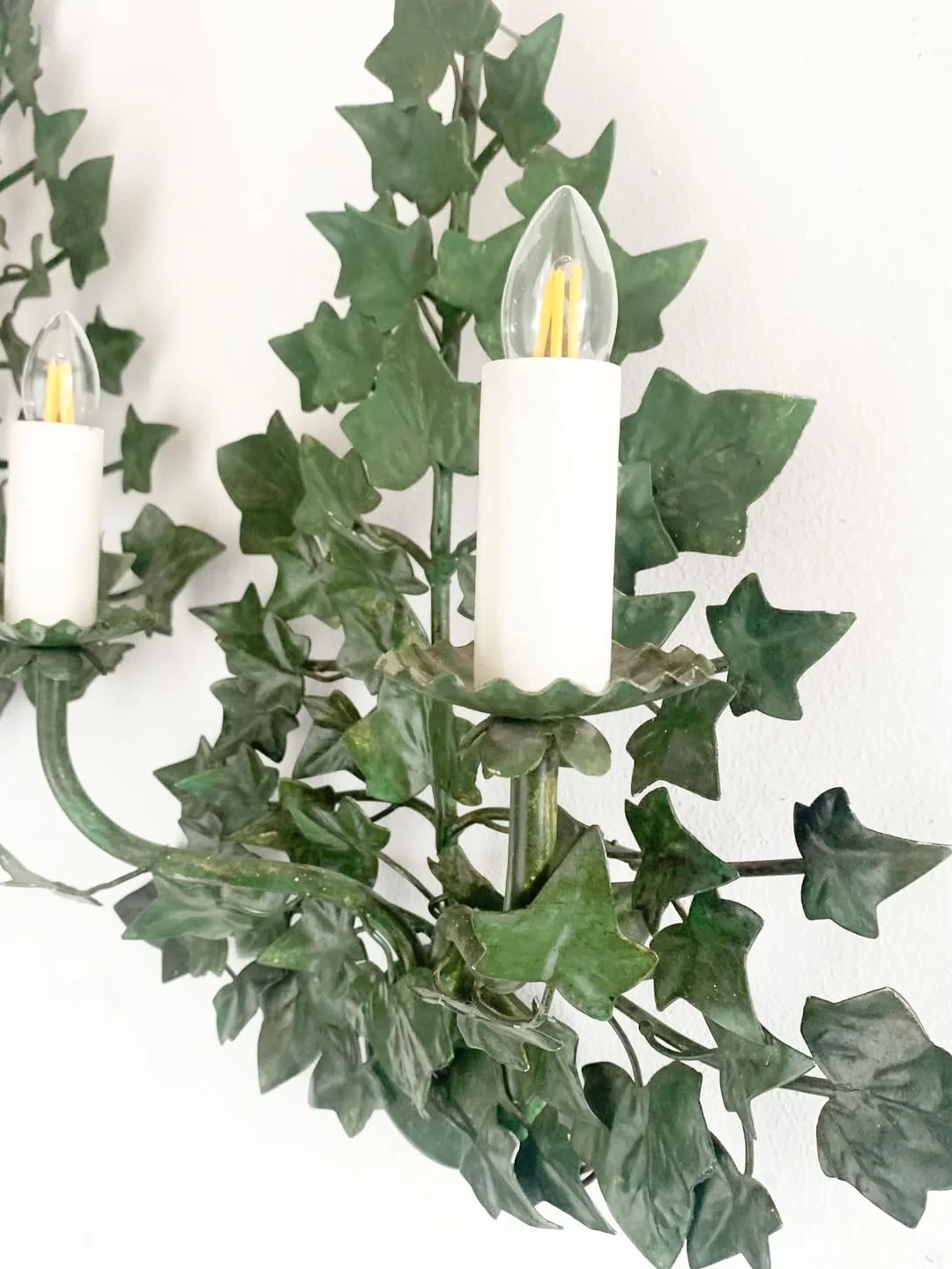 Les appliques murales anciennes en lierre présentent leurs couleurs d’origine, sans reprise ni modification. Le travail du métal met en évidence un motif végétal identifiable, utilisé comme élément décoratif principal dans l’éclairage mural ancien.