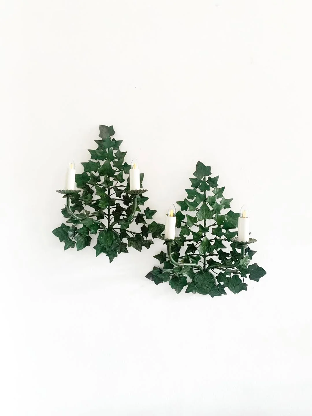 Paire d’appliques murales anciennes en lierre réalisées en métal, produites au cours du XXe siècle. Le décor végétal représente le lierre Hedera, reconnaissable à ses feuilles lobées disposées en ramification dense.