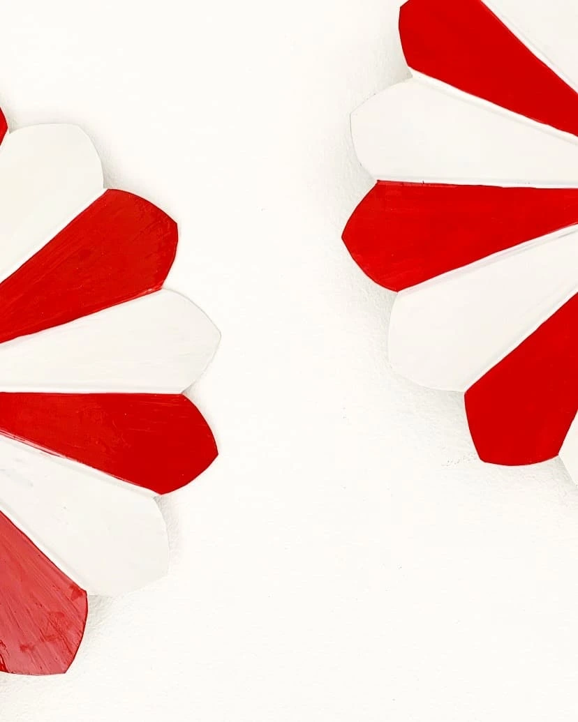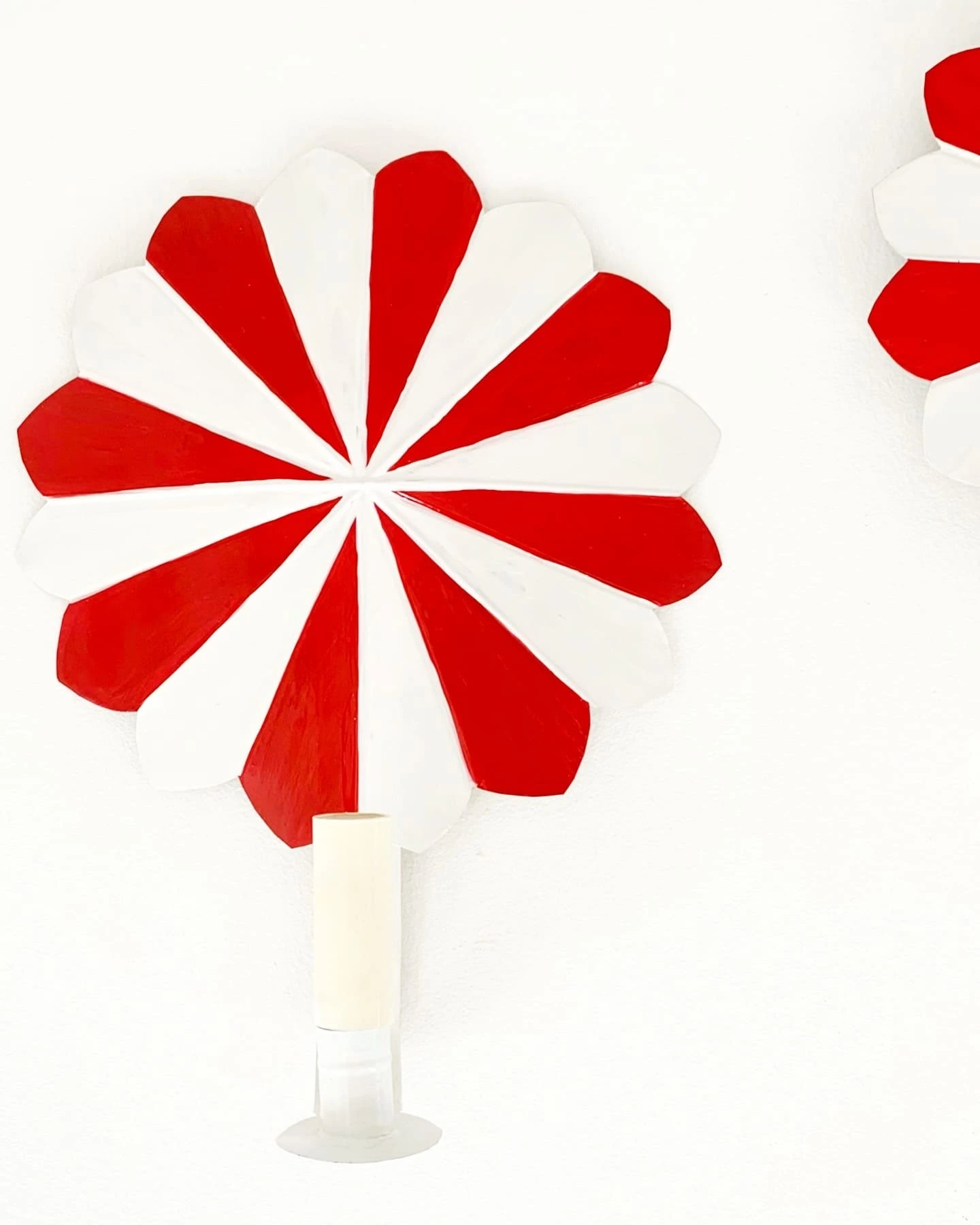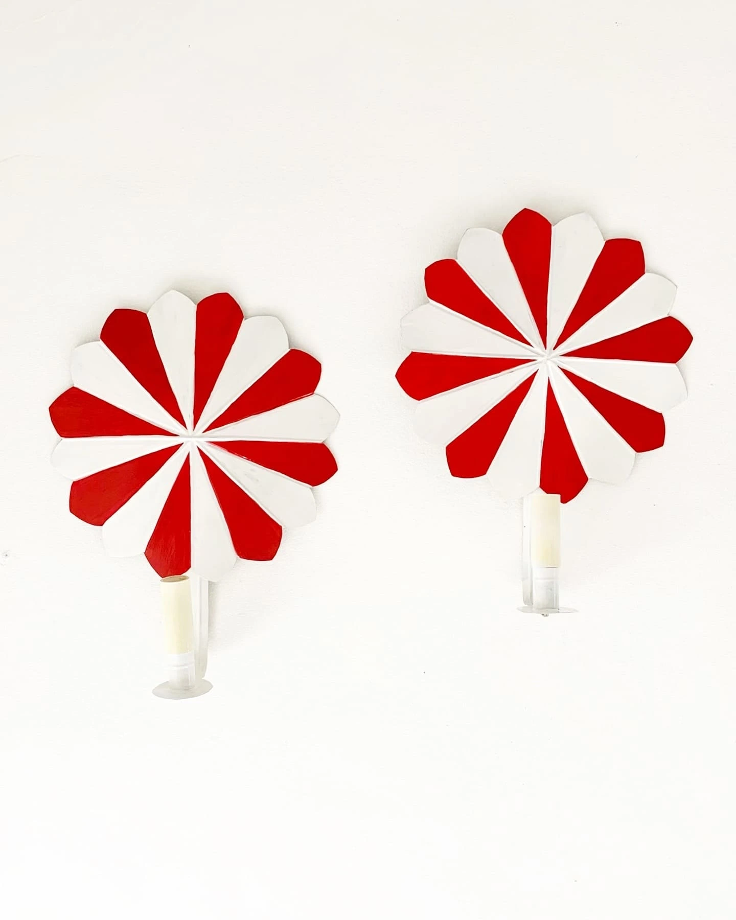 Deux appliques rondes festonnées peintes en bicolore. Parfaites pour une chambre d’enfant ou une touche de fantaisie dans une décoration plus classique.