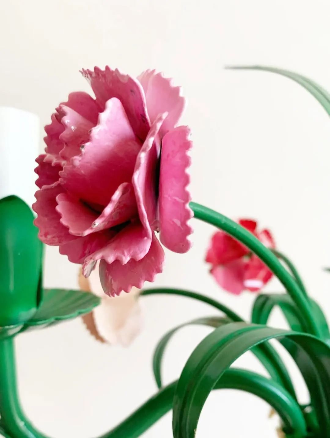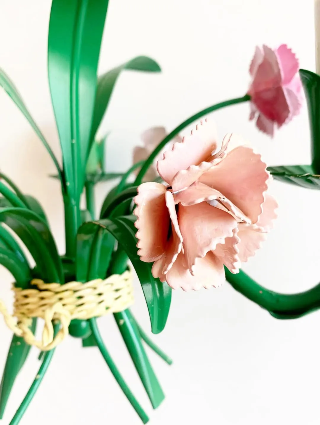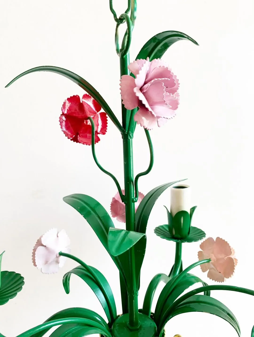Petit lustre bouquet d’œillets vintage en tôle et métal peint, composé d’une structure végétale organisée autour d’un axe central. Les bras feuillagés accueillent des bobèches évoquant des corolles, tandis que plusieurs fleurs d’œillets en métal peint ponctuent la composition.
