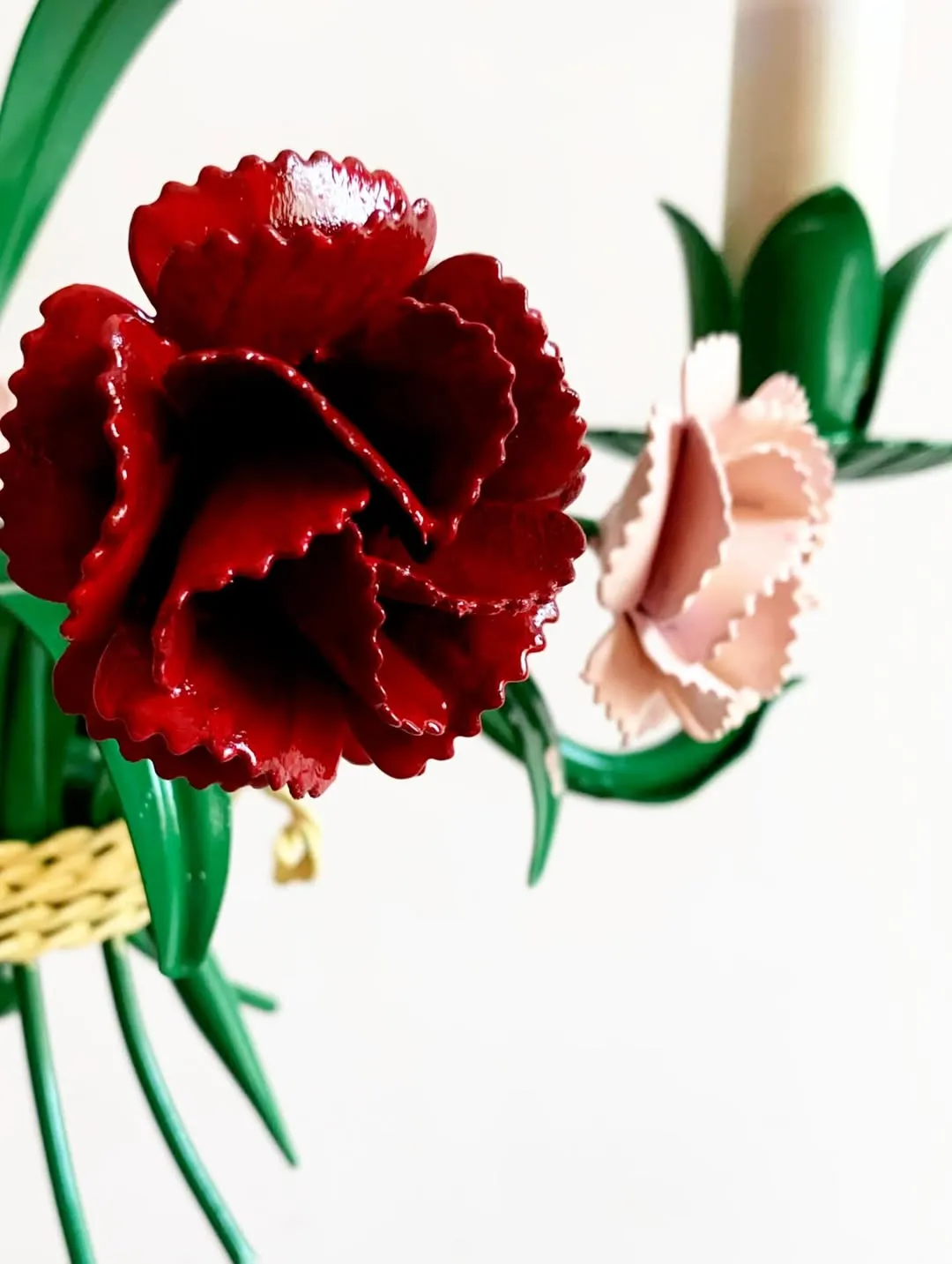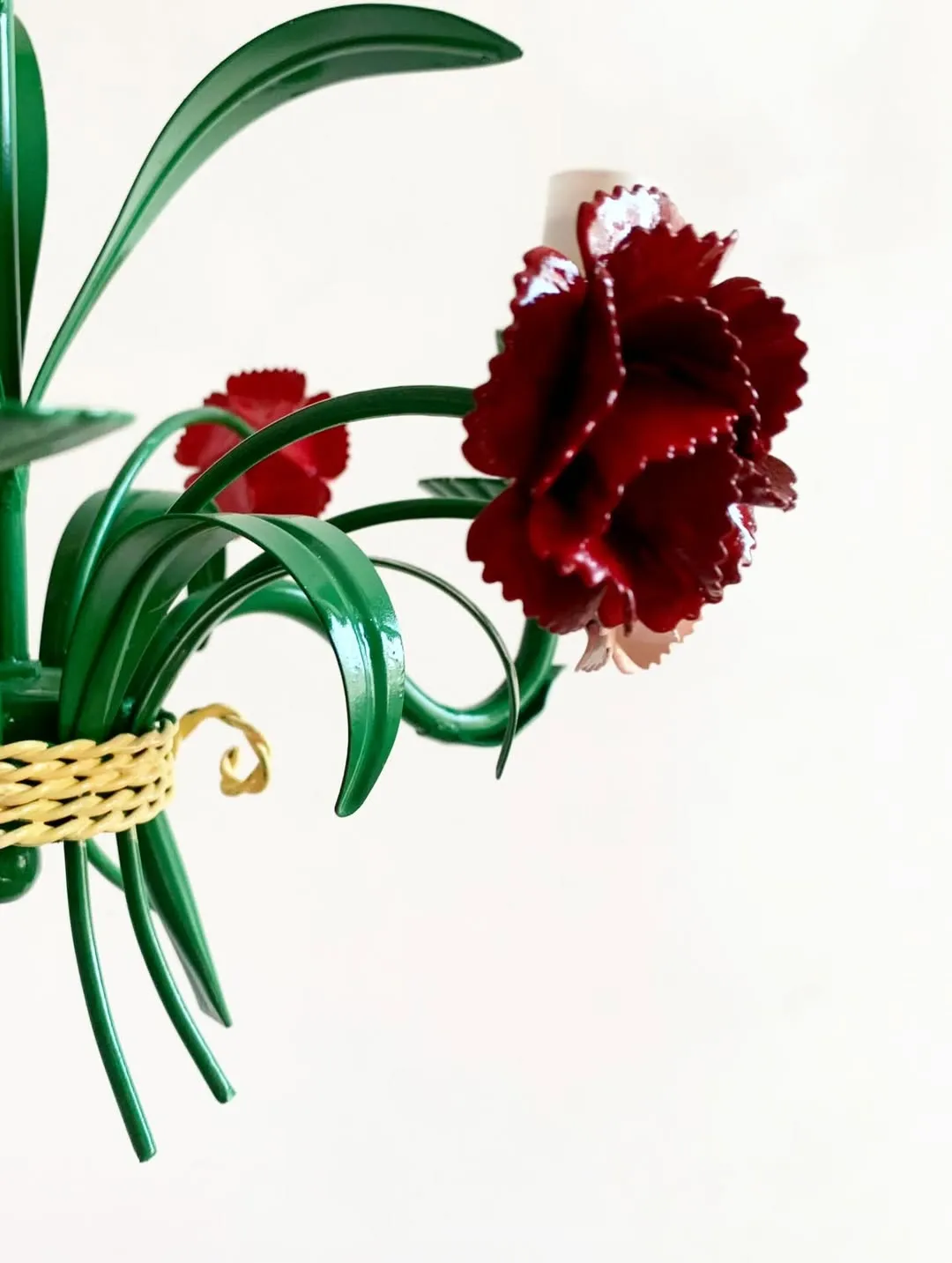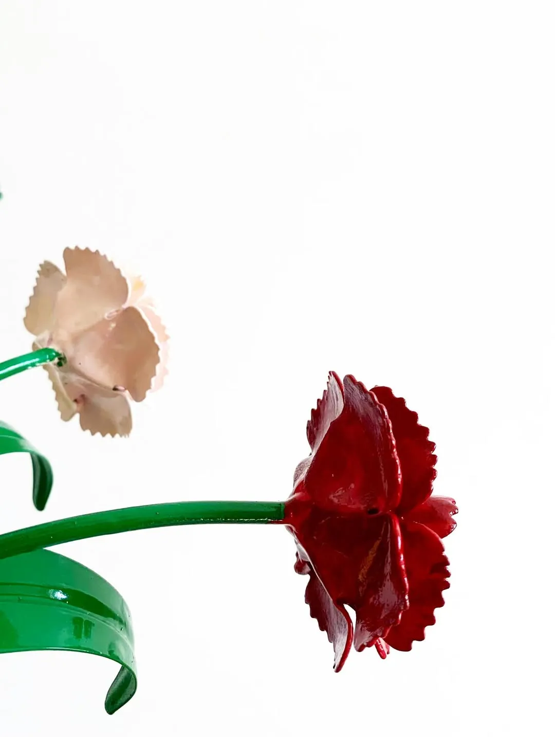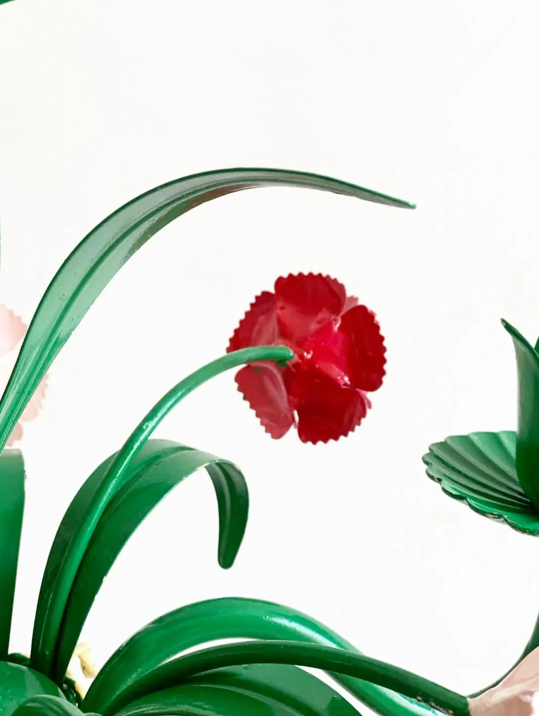 Petit lustre bouquet d’œillets vintage en tôle et métal peint, composé d’une structure végétale organisée autour d’un axe central. Les bras feuillagés accueillent des bobèches évoquant des corolles, tandis que plusieurs fleurs d’œillets en métal peint ponctuent la composition.