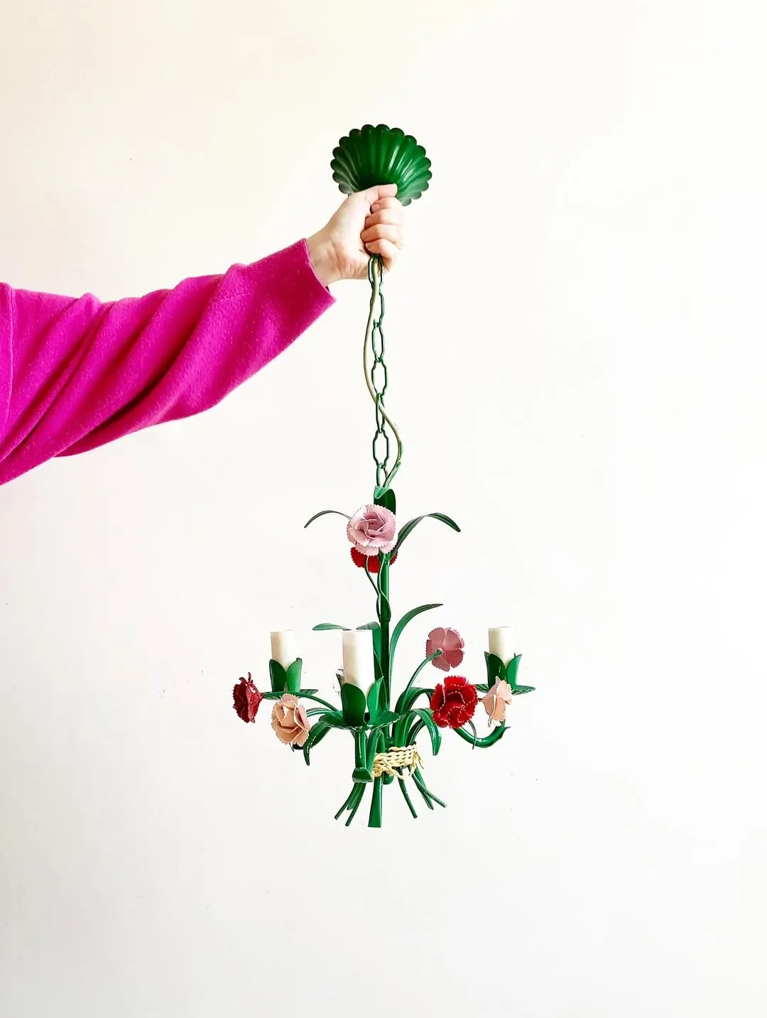 Vintage bouquet chandelier in painted metal decorated with carnations.