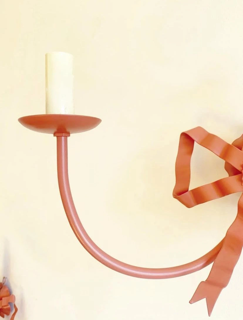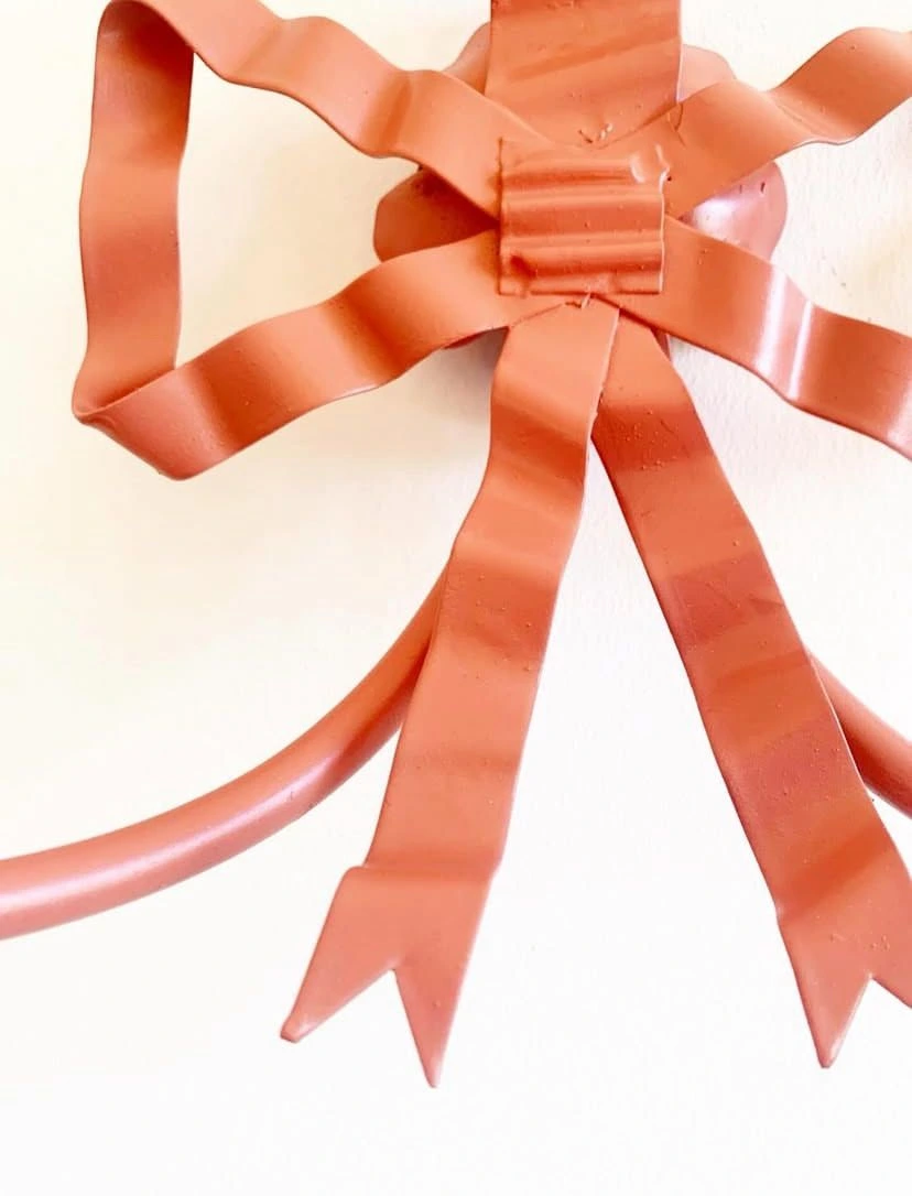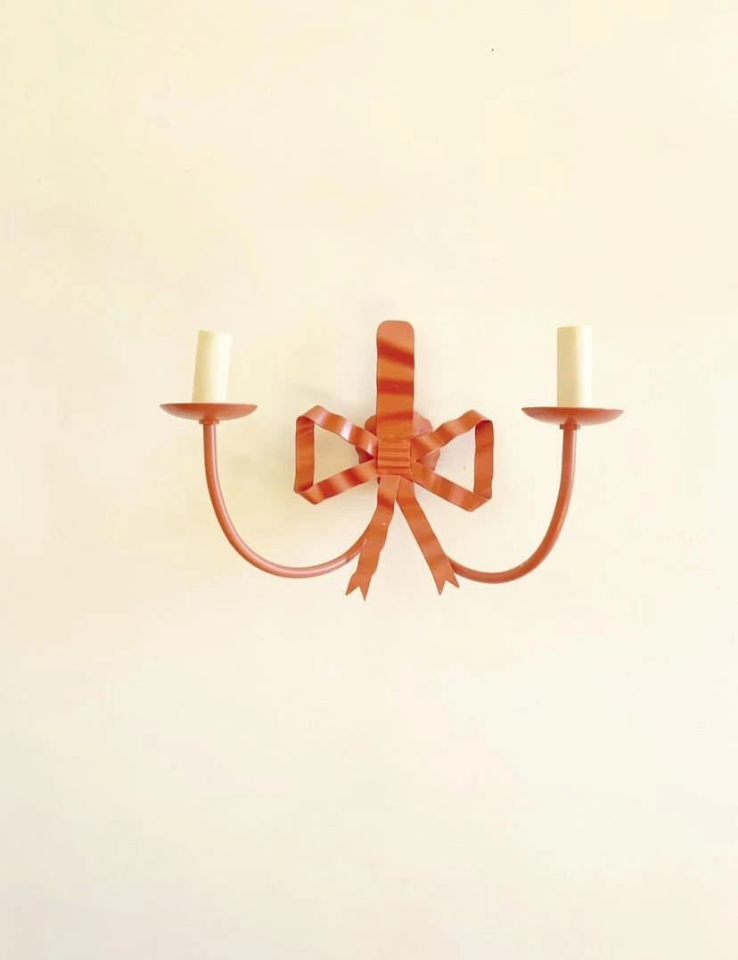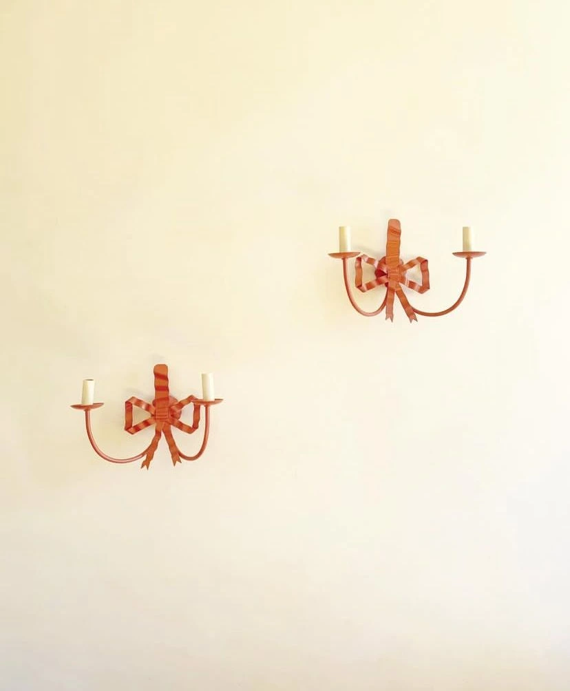 Paire d’appliques murales rubans vintage rouge brique en métal peint, décor de nœuds stylisés. Modèle créé par Maison Chaumette.