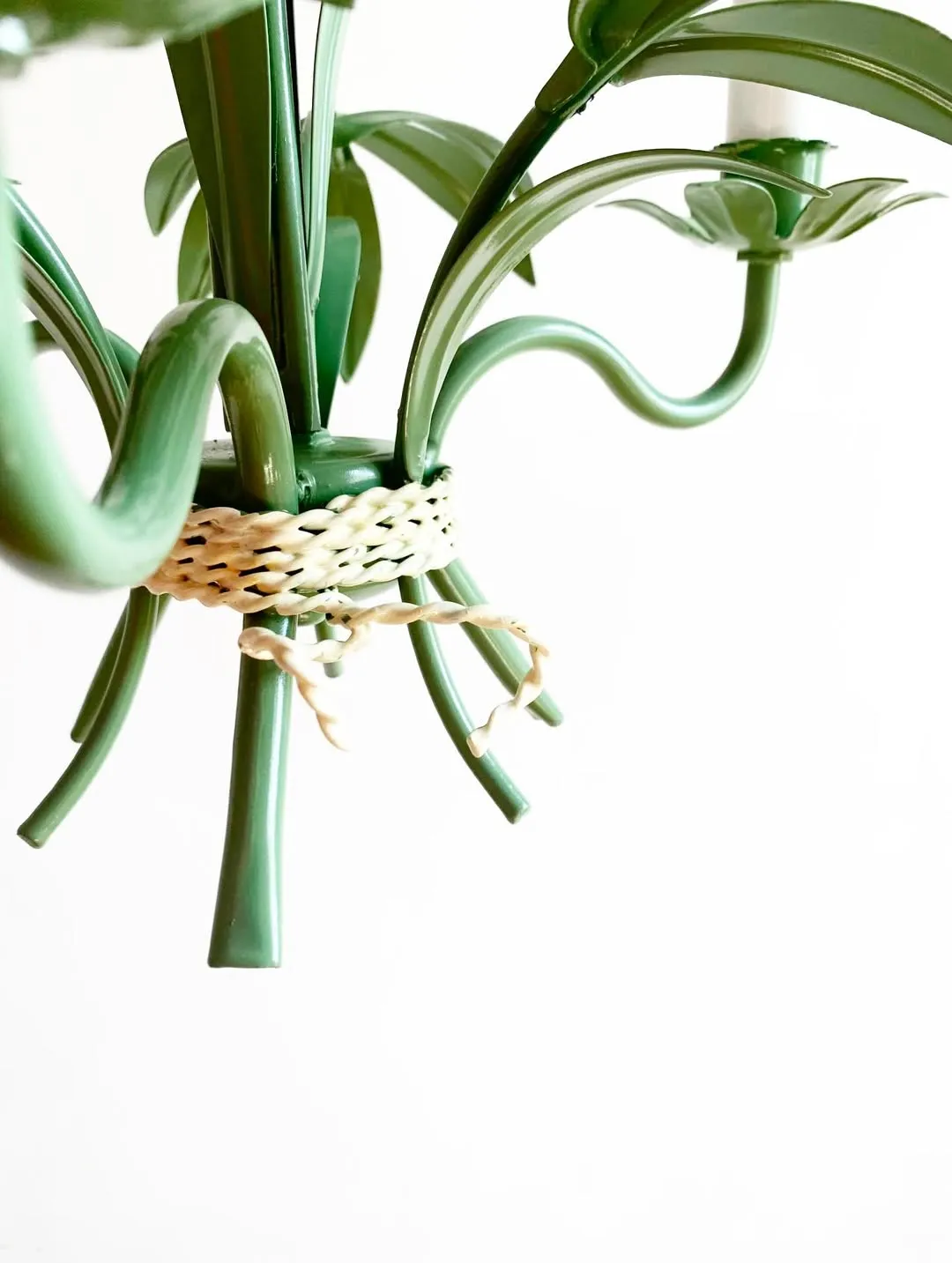 Ce lustre palmier vintage présente une structure en tôle formée et métal peint.