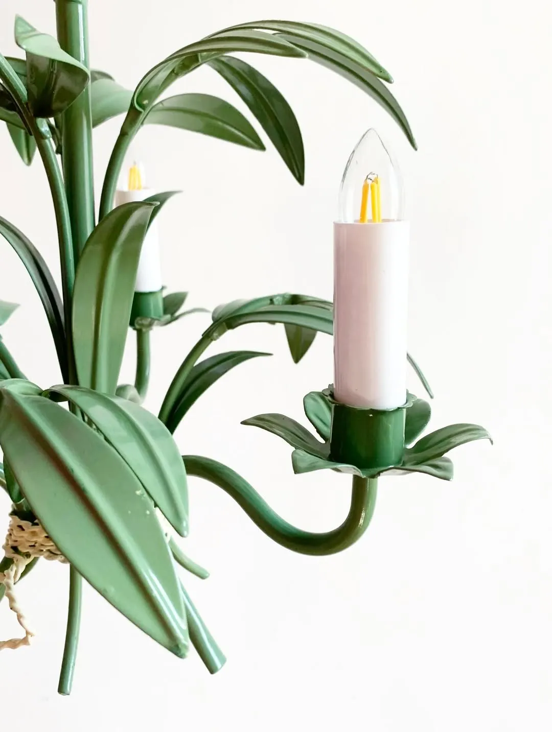 Ce luminaire botanique en métal peint s’inscrit dans la production décorative européenne des années 1950–1960.
