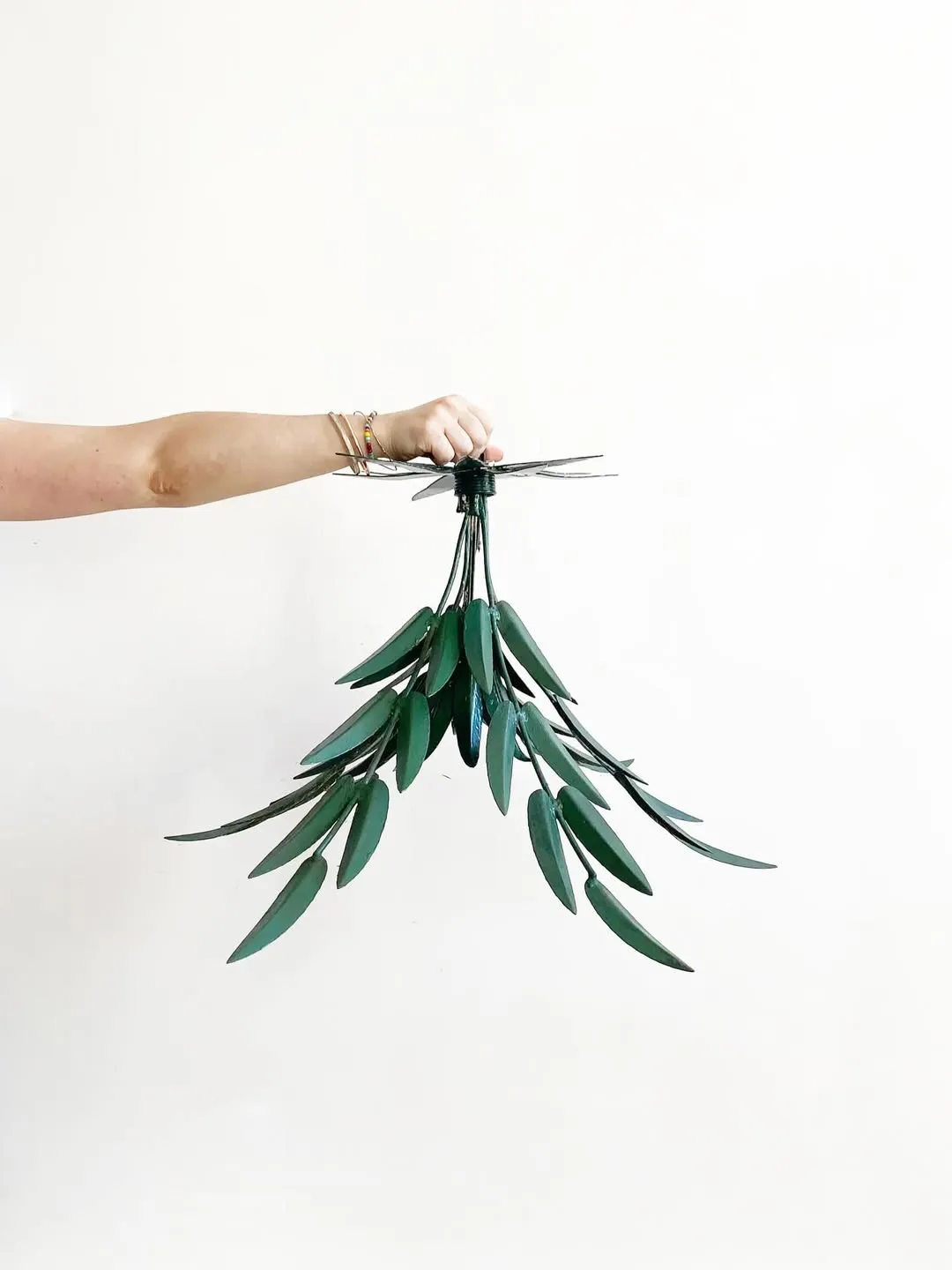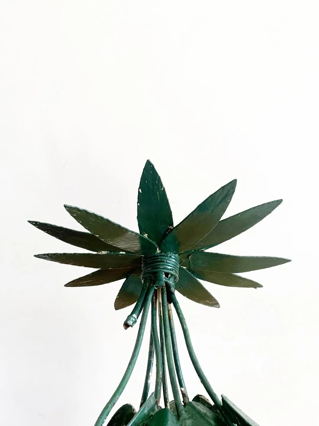 Lustre feuillage pour une décoration élégante et rustique. En tôle peinte à décor de rameaux de saule. le feuillage est d’un vert profond, la structure légère et aérienne, équilibrée autour d’une douille pouvant accueillir une ampoule lumineuse.