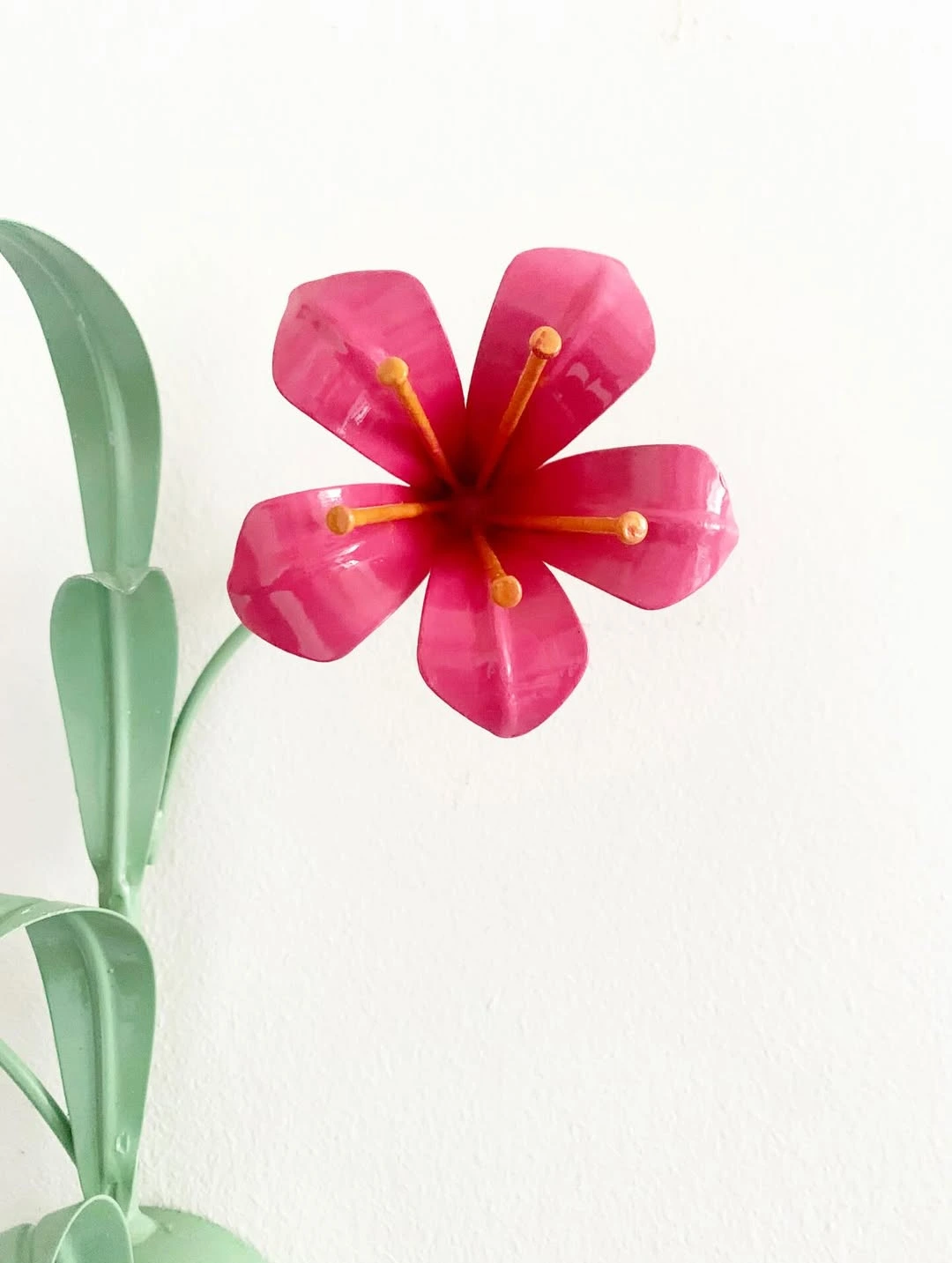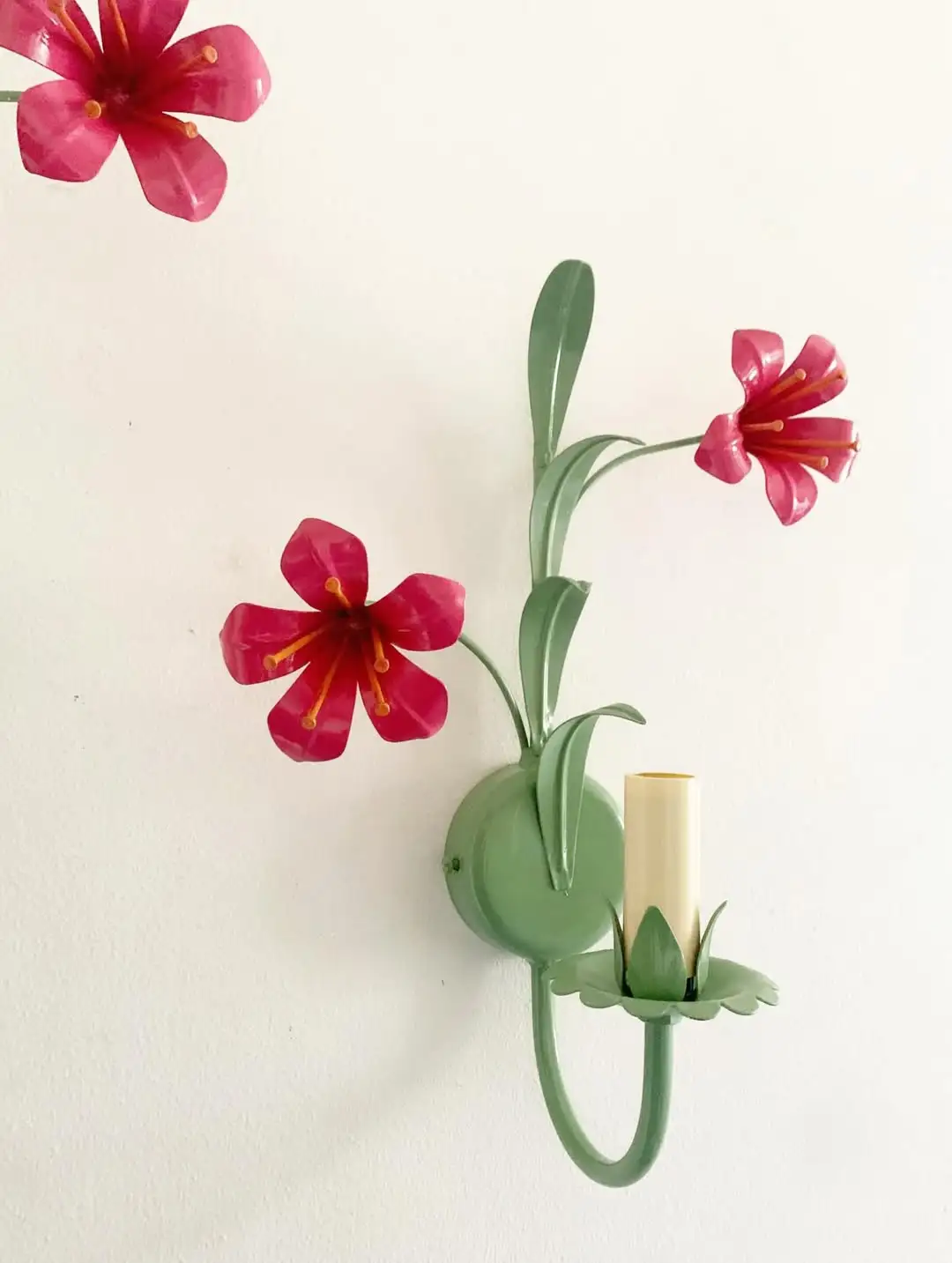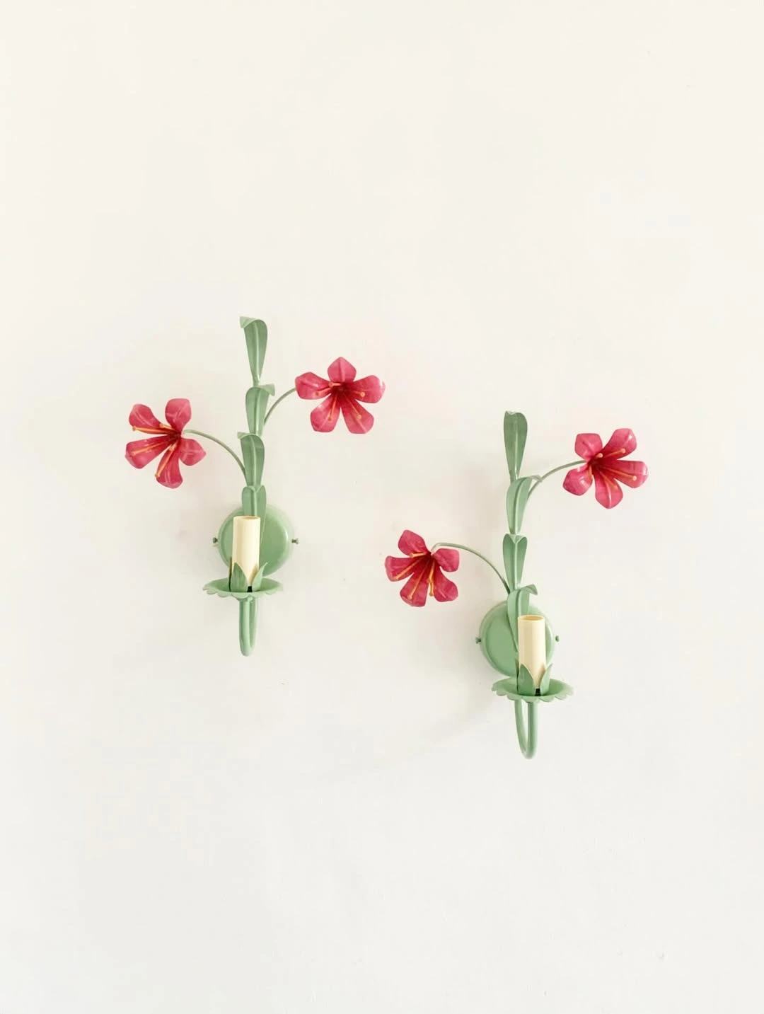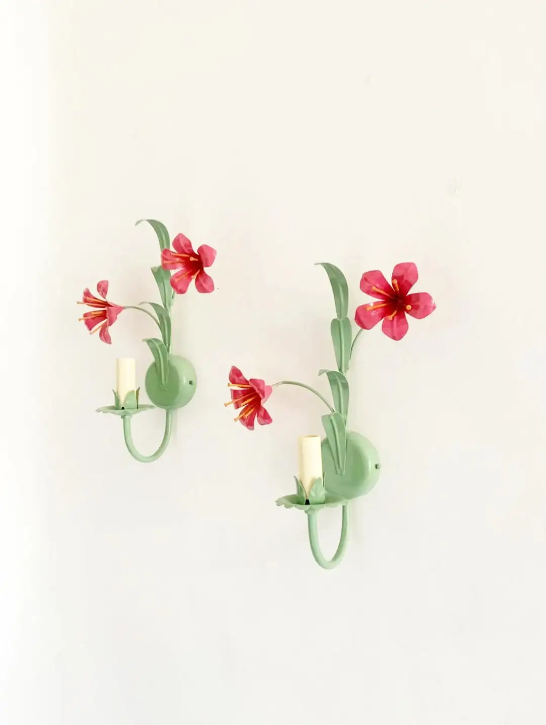 Ces appliques murales s’inscrivent dans la production européenne des années 1950–1960, marquée par un goût pour les motifs botaniques stylisés. Le contraste entre le vert tendre de la structure et le rose vif des fleurs souligne le relief du métal découpé.